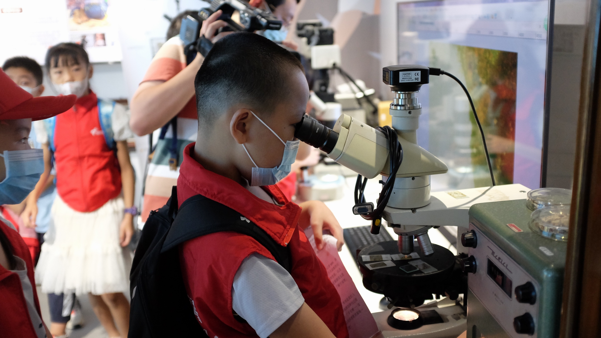 在二楼展厅,从地球的内圈层结构到板块运动,从地球的外部圈层构造到地质动力,从三大类岩石的形成到金属矿石的开采,从深海的“可乐杯”到夏威夷的黑曜石,从人造水晶的合成到黄土古人类遗址的研究,从憨态可掬的鱼化石到骨骼完整的异常华夏鸟,从资源利用到环境保护,从陨石的成因到恐龙的灭绝,讲解员用生动易懂的语言给小记者们普及了丰富多彩的地球科学和环境科学知识。极具趣味性的岩石标本,总能与天马行空的孩童世界擦出不一样的火花,他们驻足于标本馆的展柜前,好奇玻璃橱窗里的石头跟我们平时随处可见的石头有什么不同?小记者们认真聆听讲解,不时与讲解员提问互动,亲身体验偏光显微镜,观看科普影视等,提出了不少有趣的问题。
