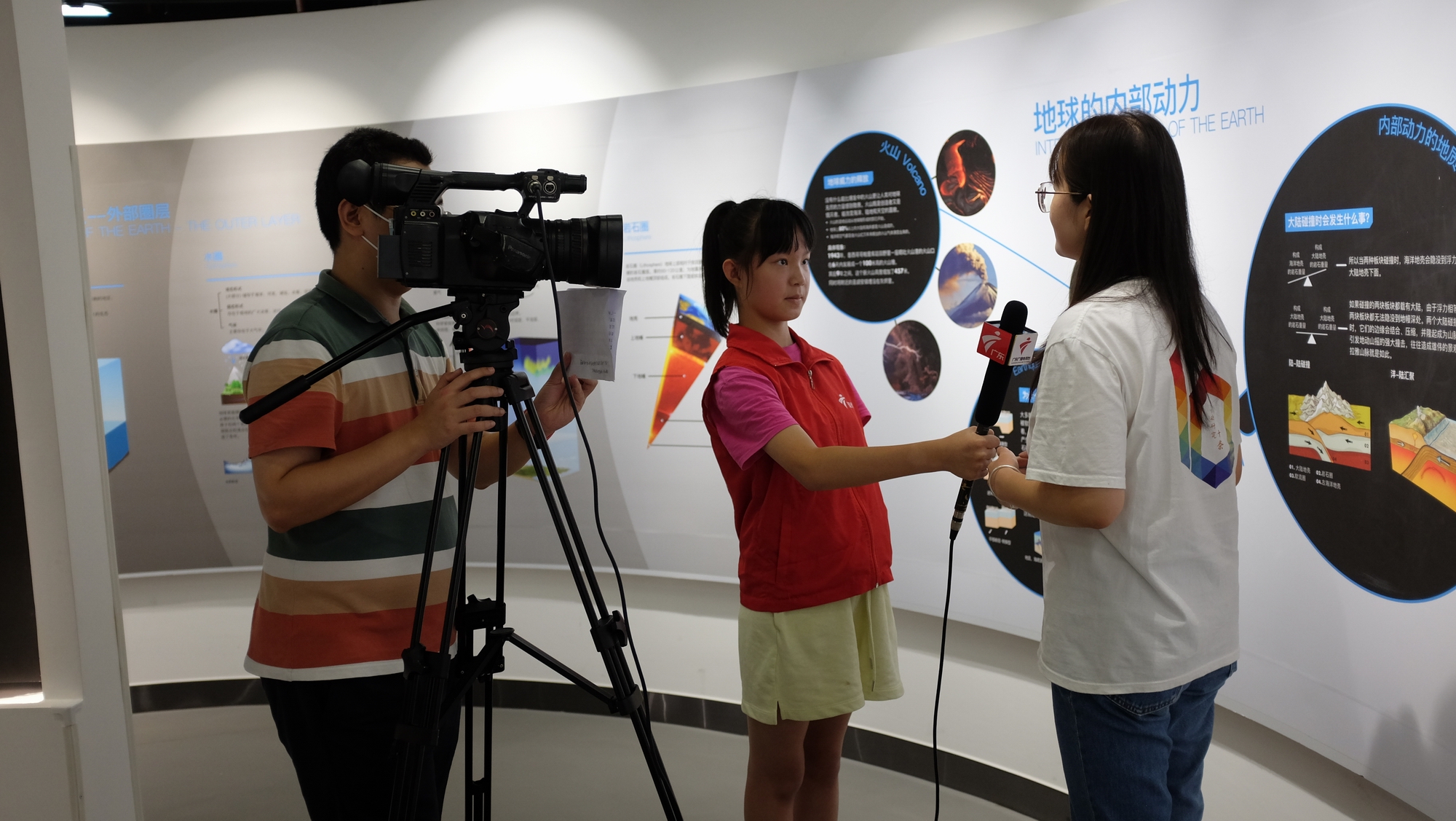 参观完标本陈列馆后,小记者们来到科普讲座厅,整理自己的参观心得体会,并一一出镜说出了自己本次参观地学与资源科普基地的收获。最后,小记者们采访了讲解员老师,表达了对地球科学这个学科的浓厚兴趣,讲解员老师也对小记者提出的问题做出了详细的解答。