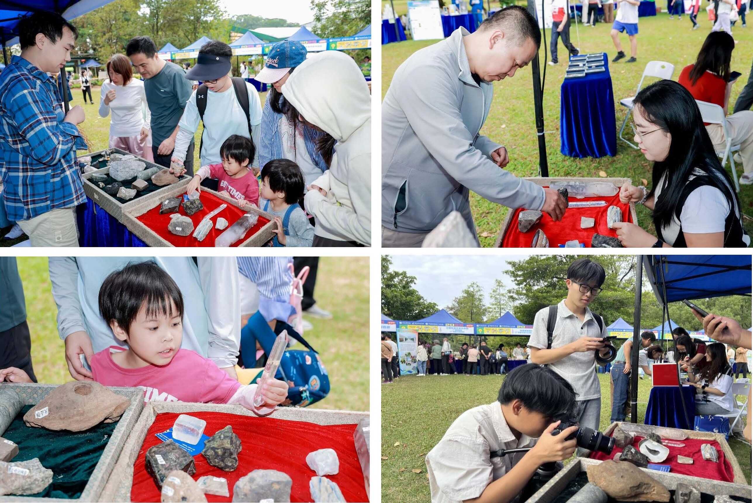 中国科学院广州地球化学研究所布置了《石语寻踪——我们的资源、我们的地球》为主题的地质标本实物展,展出五十余件珍贵的地质标本。叠层石、角石、王冠虫、鱼类等珍贵史前生物化石;锂、铁、钨、锡、锰、铅等金属矿产矿石以及形态精美的水晶、冰洲石、碧玺、黄铁矿等矿物晶体,吸引了众多青少年和公众驻足观看。一块块形态各异的地质标本,宛如一部部无言的史书,静静诉说着地球 46 亿年的沧桑巨变。科普志愿者用通俗易懂的语言,向公众详细讲解各类展品的科学内涵。通过实物标本展,让公众和青少年近距离触摸“石头”标本,探秘矿物与岩石新世界,了解地球生命起源与演化,直观地看到与我们生活息息相关的矿石类型、矿石标本的结构与构造特征,感受地球的奇妙。