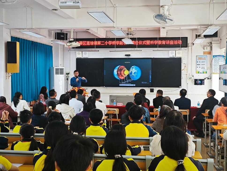 在热烈的氛围中,莲塘镇第二小学隆重聘任中国科学院广州地球化学研究所刘星成研究员为科学副校长。一纸聘书,不仅是一份荣誉,更是一份责任,标志着高校科研资源与基础教育实践实现深度对接,为学校科学教育注入鲜活的专业力量。刘星成研究员表示很荣幸受聘为科学副校长,将充分发挥自身科研与科普经验,助力学生科学素养提升,推动学校科学教育高质量发展。