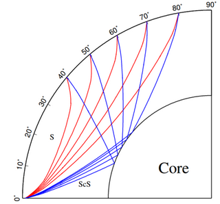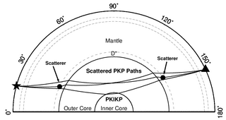 图1. (a) PKIKP波和散射波的射线路径示意图。 (b) S和ScS波射线路径示意图。