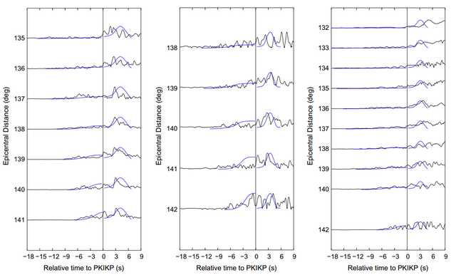 图2. 三个区域三个地震的观测(黑色)和模拟(蓝色)的地震波包示意图。