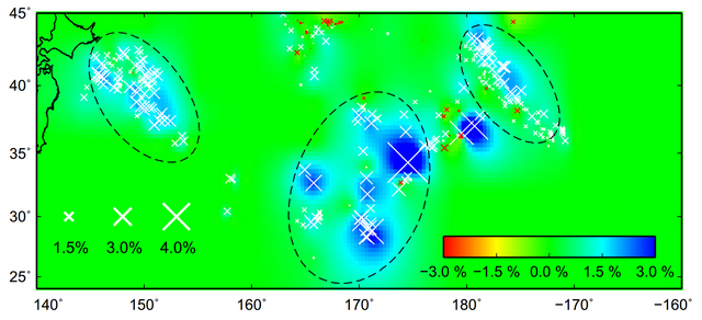 他们综合分析了南极流动台站记录到的发生在勘察加半岛和阿留申群岛的PKP前导波信息,通过偏移成像以及对散射能量的拟合,发现产生这些PKP前导波的强散射体结构大体分布在北纬30-40°之间,深度在核幔边界之上400公里范围内。与前人研究所不同的地方在于,他们发现这些散射体的结构是非均一性的,存着横向不均匀性:散射体区域大致分为三部分:西部(140-160°E),中部(160-180°E),东部(180-200°E)。其中,中部区域的散射体呈现出1.0-1.2%的P波速度扰动,而两边的西部和东部区域速度扰动只有0.5% (图2)。 利用ScS-S相对到时残差的方法对同样的区域进行了分析,研究组也得到了类似的分布趋势:中间区域的S波速度异常为2.0-3.0%,而两边的速度异常为1.0-1.5% (图3)。综合以上结果,研究者认为这些散射体结构可能是古俯冲板块在核幔边界处的残余,而这种散射强度的横向不均匀性变化可能有两种原因导致:(1)不同的俯冲板块导致的物质物性不同;(2)同一板块内部组分在分异过程中分离出不同物质。