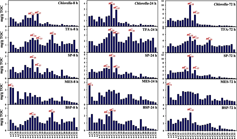 图4. 在不同裂解时间下,小球藻及其NHC组分产生的正构烷烃(n-C6-33)含量。