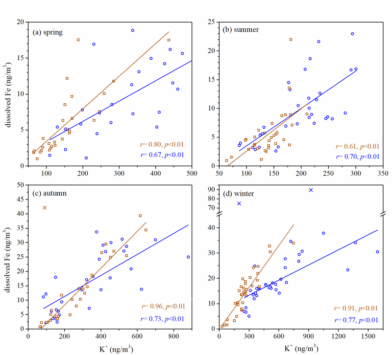图1. 各个季节粗细粒子中可溶性Fe与钾离子的相关性。