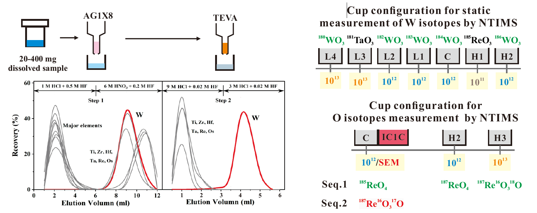 同时研究团队还建立了微量样品的W同位素高精度热电离质谱(TIMS)测定方法。采用法拉第杯和新型1012和1013 Ω放大器,对W同位素组成进行静态分析。并首次提出使用ReO4对样品进行O同位素高精度测定,有效提高了W同位素数据的准确度和精度。通过以上新建立的方法,实现了对W总量>30 ng的样品测定获得182W/184W 比值精度<6 ppm的结果,即仅使用常规方法1/30-1/50的样品量,可获得常规方法的最佳精度。化学流程曲线和TIMS测定方法见图1。