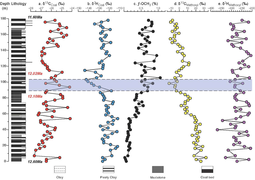 古地磁定年研究结果显示小龙潭煤层剖面的年龄范围为约11.6-12.6Ma。图2中结果显示在12.1Ma左右,剖面上煤的稳定氢同位素比值、煤分子结构中甲氧基含量及其稳定碳同位素比值发生了协同的漂移。由于剖面上煤的稳定氢同位素比值主要受控于区域大气降水比值的约束,在纬度相同、海陆距离不变的情况下,大气降水稳定氢同位素演变具有明显的海拔效应。推测该时期小龙潭盆地经历了一次显著的隆升过程。煤层剖面甲氧基含量与甲氧基稳定碳同位素相关性在抬升前后差异明显,抬升前受到沉积热演化的约束,二者呈现协同演化,抬升后甲氧基碳同位素的变化不再受控于甲氧基含量,其演变机制有待更深入的研究以及更多古环境、古生态学参数的对比讨论。