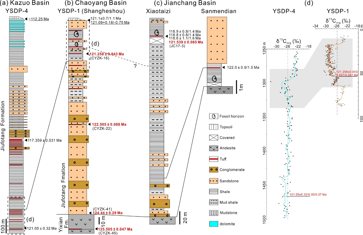 热河生物群(Jehol Biota)是全球保存最为精美的早白垩世特异埋藏化石群,包含羽毛恐龙、原始鸟类和早期被子植物等,是研究生物辐射演化和陆地生态系统演化的重要窗口。然而,其晚期阶段(即九佛堂组)的时间跨度由于以往年代学数据精度有限、取样层位不够理想而尚不明确。厘定这一关键时期的时间框架,对于揭示古环境变迁与生物演化之间的耦合关系具有重要意义。