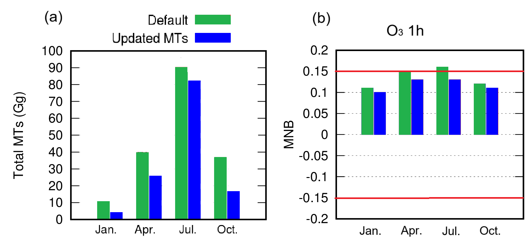图1 算法更新前(Default)后(Updated MTs),(a)广东省四季单萜烯排放量估算对比;(b)臭氧观测值与模拟值逐小时浓度平均标准化偏差(MNB)对比(红线表示U.S. EPA标准值)