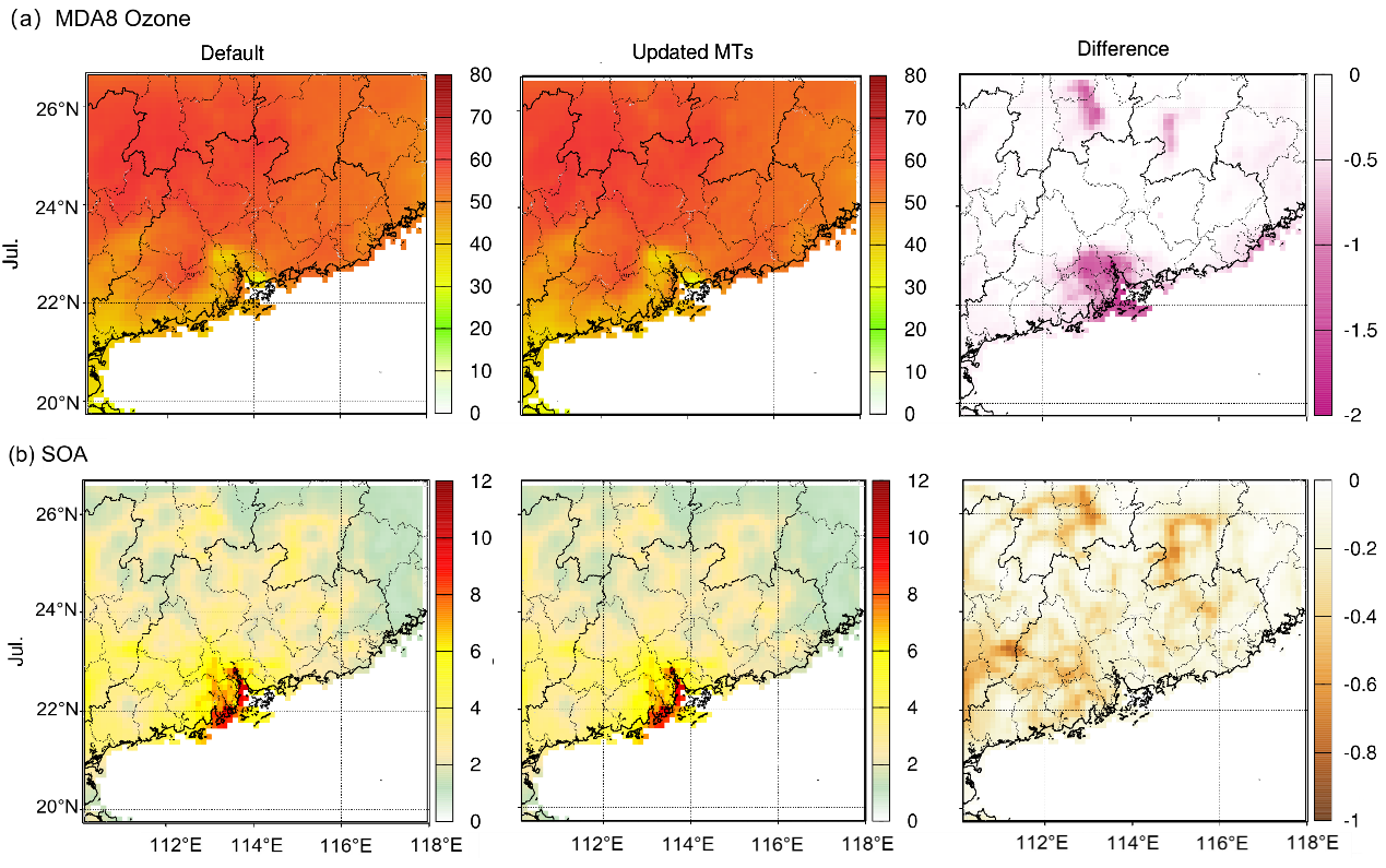 图2 算法更新前(Default)和后(Updated MTs);(a)夏季臭氧日最大8小时平均浓度(ppb); (b) SOA浓度(μg/m3 )的模拟值对比