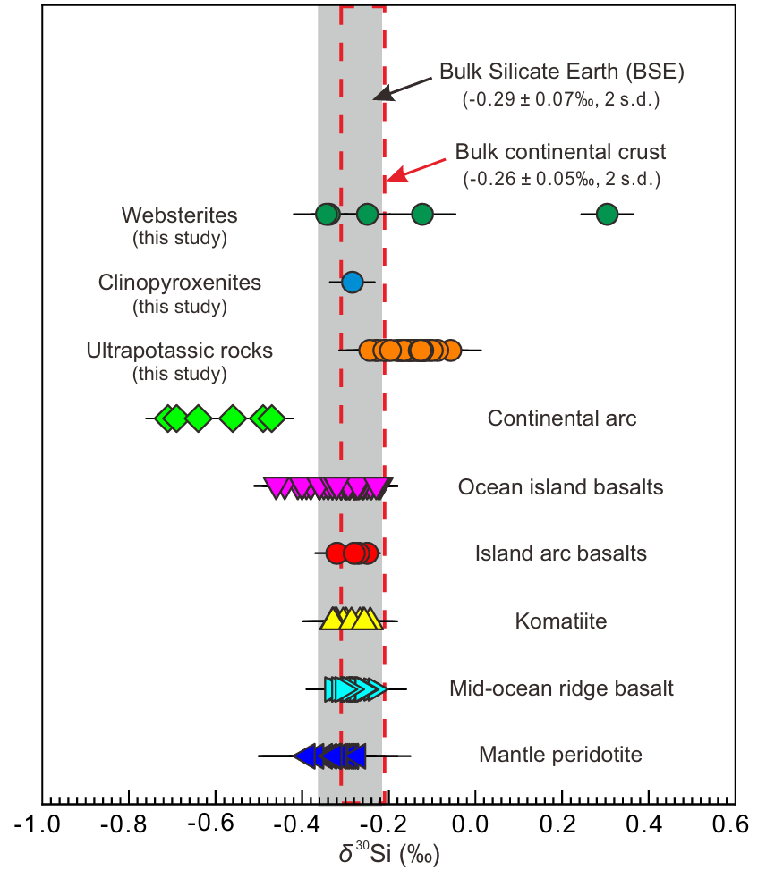 硅是地球中丰度第三的元素,其在地球不同地质储库中的分布与循环过程对理解地球内部物质分异和地表环境演化具有重要意义。硅有三种稳定同位素(28Si, 29Si, 和30Si),常被应用于示踪硅的地球化学循环过程。然而,要准确利用硅同位素作为“示踪剂”,必须明确其在各类地质储库中的组成特征。传统观点认为,地幔高温部分熔融形成新生地壳的过程不会引起显著的硅同位素分馏,且由于大陆地壳与全硅酸盐地球(Bulk Silicate Earth, BSE)的硅同位素组成几乎一致(见图1),因此,地幔被认为与BSE具有相似的硅同位素组成,不应出现明显异常。然而,近年来发现一些洋岛玄武岩(OIB)和大陆弧岩浆具有显著偏轻的硅同位素组成(低于BSE),这暗示地幔中应存在一个与之互补的重硅同位素储库以维持全球硅同位素的质量平衡。但此前报道的各类地幔岩石(包括橄榄岩、辉石岩及其熔融产物)的硅同位素数据大多等于或轻于BSE,重硅地幔储库始终未被明确识别。