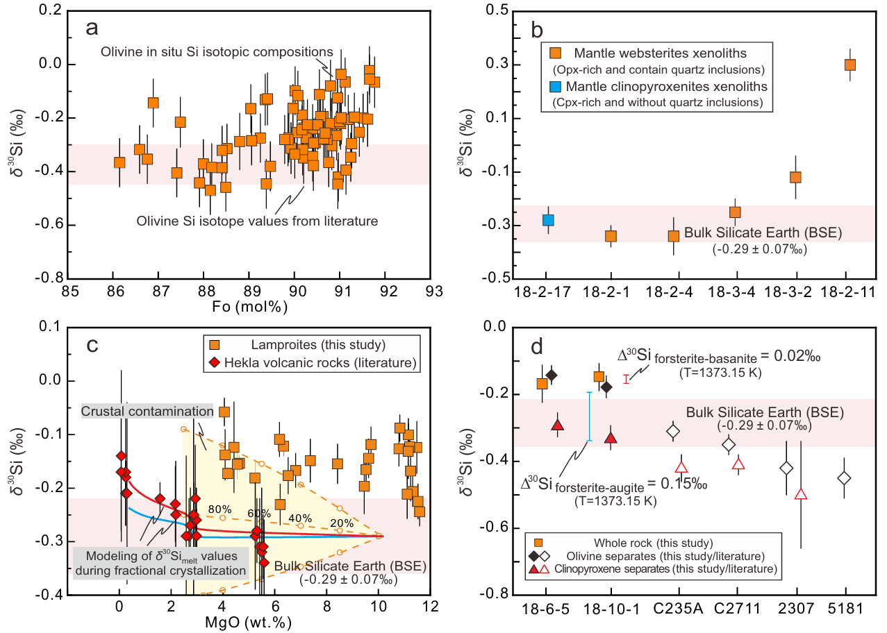 喜马拉雅-青藏造山带出露大量新生代幔源超钾质岩石,这类岩石源于富集地幔的低程度部分熔融,往往反映了地幔源区的不均一性,是研究上述问题的理想对象。研究团队选择喜马拉雅-青藏造山带碰撞后钾镁煌斑岩和伴生地幔辉石岩捕虏体作为研究对象,通过系统的全岩与微区硅同位素分析,取得了以下认识:(1)拉萨地体中新世钾镁煌斑岩及其地幔包体的硅同位素值显著重于BSE,是目前国际上报道的硅同位素最偏重的地幔岩石(图1);(2)钾镁煌斑岩的重硅同位素组成并非由壳内演化过程(例如地表风化、壳内分离结晶及地壳混染)所致,而是直接继承自其地幔源区(图2);(3)板片熔融过程会发生显著的Si同位素分馏,残留相(如石榴子石+单斜辉石)富集轻硅同位素,而熔体则富集重硅同位素(图3)。结合前人已发表的资料,重硅同位素储库的形成可能与俯冲印度大陆板片熔体引起的地幔交代作用有关。
