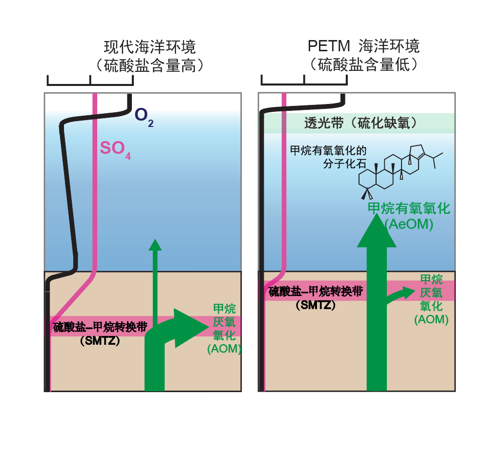 概念图:PETM时期北极海洋甲烷氧化路径转变概念图(研究团队供图)