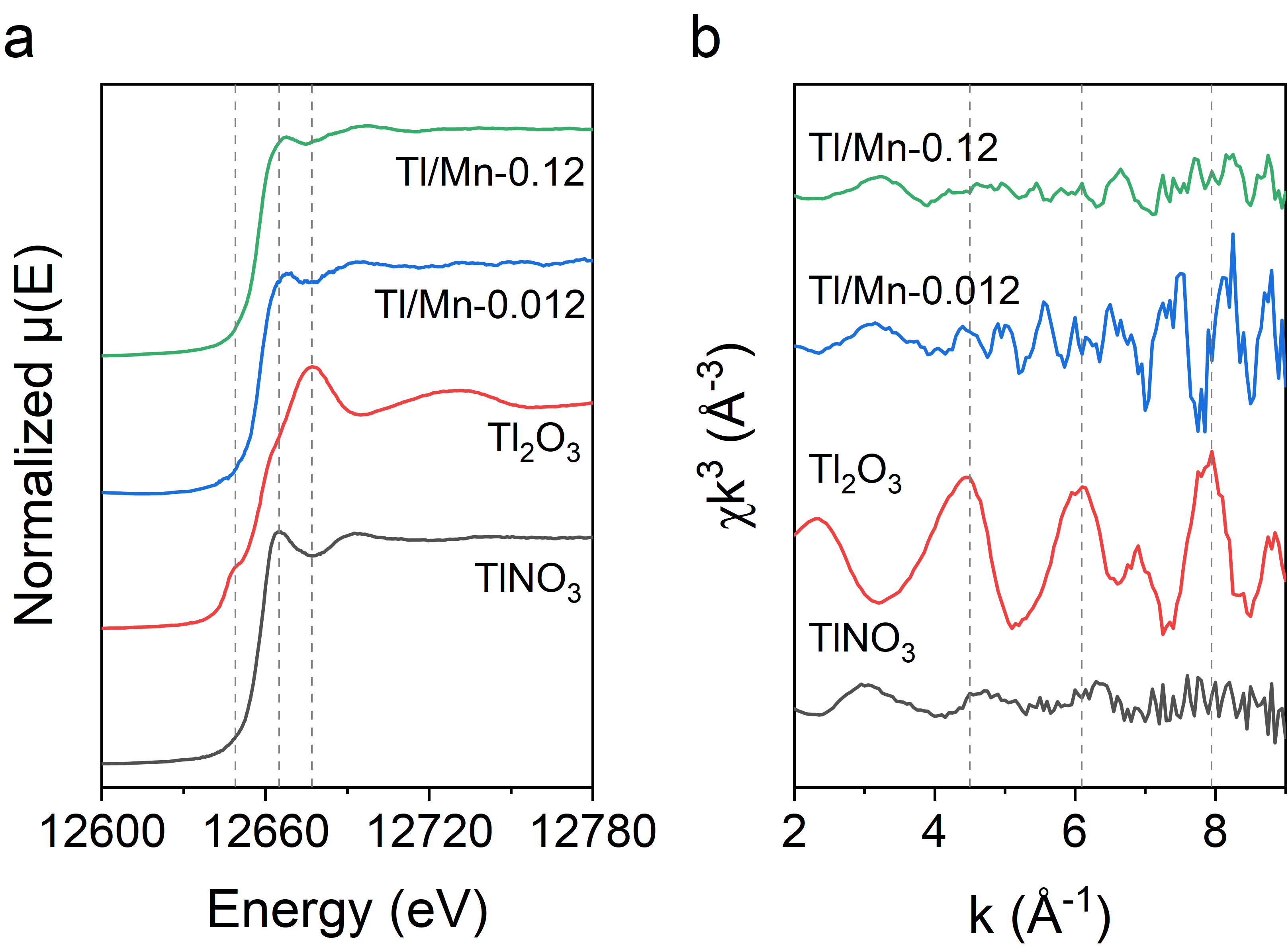 图2 Tl LIII边(a)XANES谱与(b)k3加权EXAFS谱