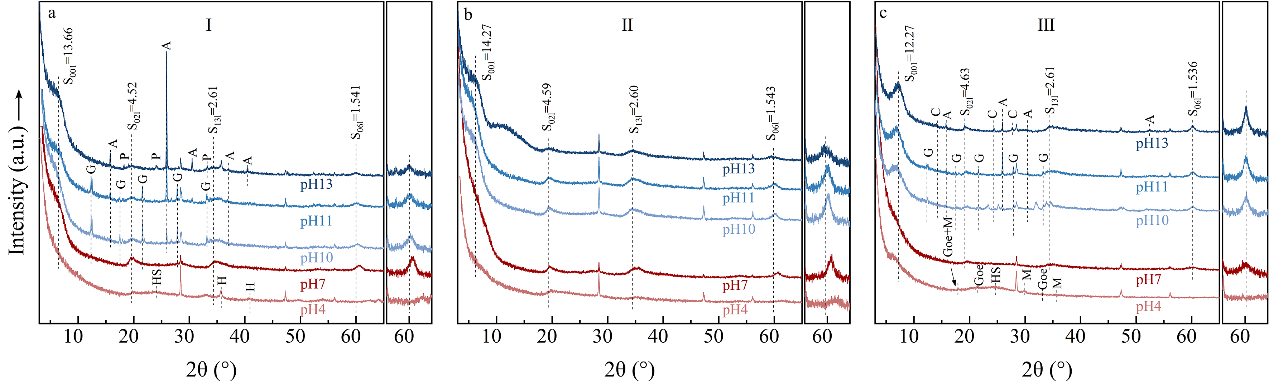 在酸性条件下,Al优先占据蒙皂石晶格,进而调控Fe是以类质同象形式进入蒙皂石结构,还是独立形成赤铁矿、针铁矿等氧化物。在氧化性酸性环境中,蒙皂石内Fe/Mg比值升高,其晶体学上表现为(06l)晶面间距随pH升高而增大(图4)。该趋势与火星遥感数据结果中蒙皂石普遍呈现高Fe/Mg比的现象高度吻合,为理解火星蒙皂石与母岩成分之间的分异机制提供了实验依据。