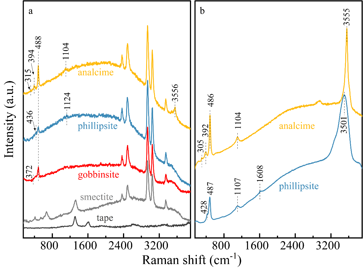 随着环境pH值由中性向强碱性升高,共生矿物呈现清晰的演化序列:蒙皂石→蒙皂石+戈沸石(gobbinsite)+方沸石(立方体)→蒙皂石+十字沸石(phillipsite)+方沸石(立方体和四角三八面体聚型)(图1,2)。针对火星探测中沸石识别难度大的问题,本研究指出拉曼光谱能通过识别硅氧骨架中T-O-T对称弯曲振动模式(图3),有效弥补可见光-近红外反射光谱(VNIR)在该类矿物鉴定上的不足。