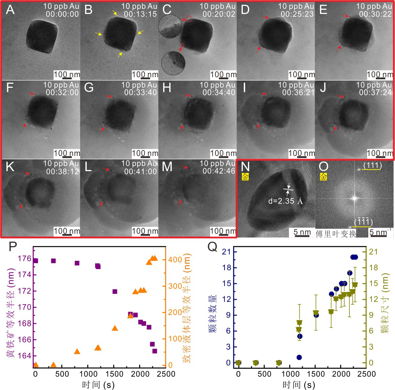 图1. 黄铁矿-水界面致密液体层中AuNPs的沉淀过程。(A–M)原位液相透射电镜观测黄铁矿与10 ppb HAuCl4溶液(pH=3.5)反应的时间演化序列;黄色箭头指示致密液体层的形成,红色圆圈标记AuNPs的沉淀位置;(N–O)原位液相透射电镜拍摄的AuNPs高分辨透射电镜图像及对应快速傅里叶变换图谱;(P)黄铁矿与致密液体层的等效半径变化趋势;(Q)AuNPs颗粒数量与粒径随时间的变化。