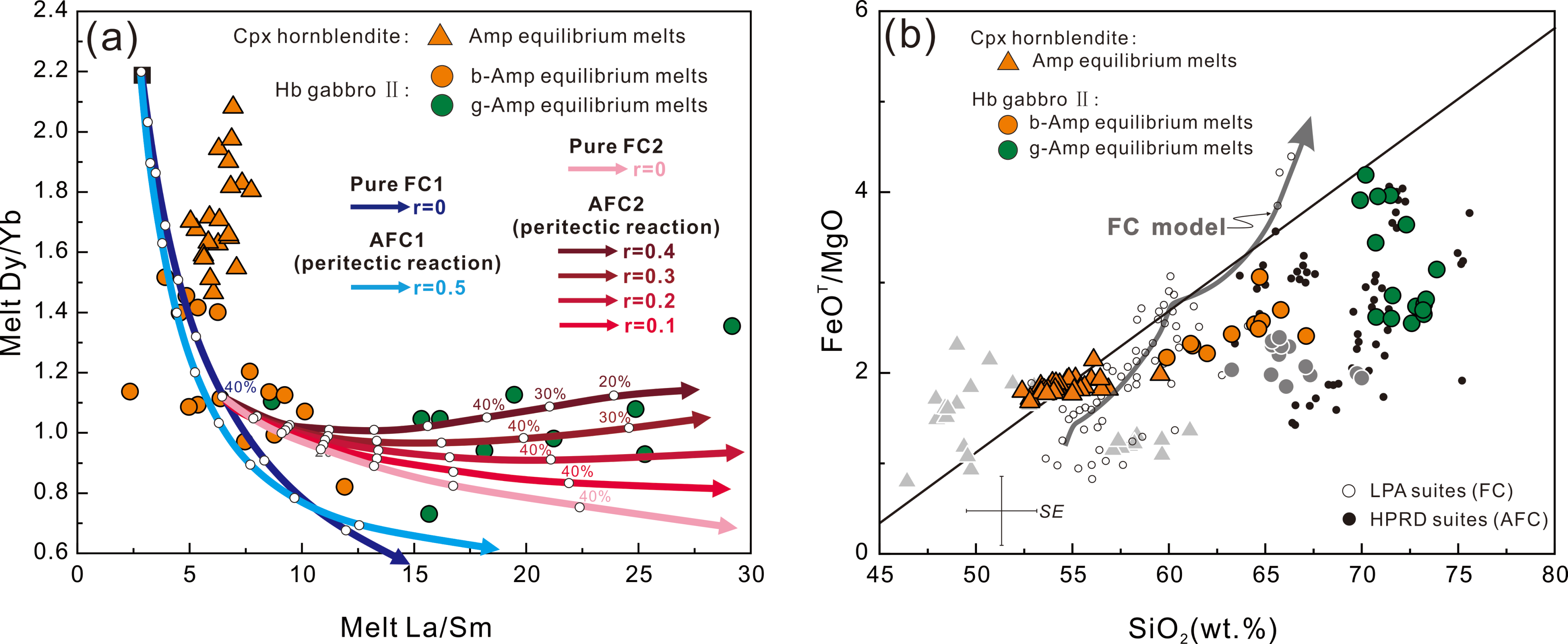 图3 (a)两阶段AFC过程模拟;(b)第二类辉长岩中角闪石平衡熔体的SiO2与FeOT/MgO比值的变化趋势