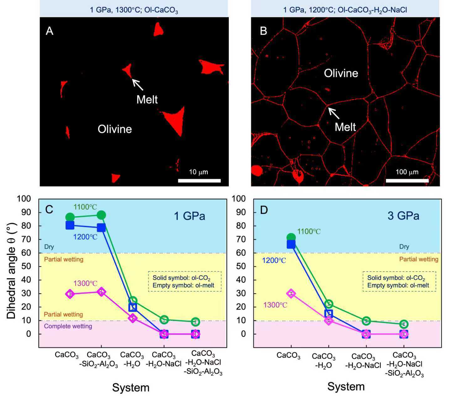 (A)橄榄石中相对孤立分布的(不含挥发分)碳酸盐熔体;(B)橄榄石中完全连通的含挥发分碳酸盐熔体网络;(C-D)挥发分的加入使得橄榄石–碳酸盐熔体间二面角迅速下降为0°。Ol代表橄榄石。