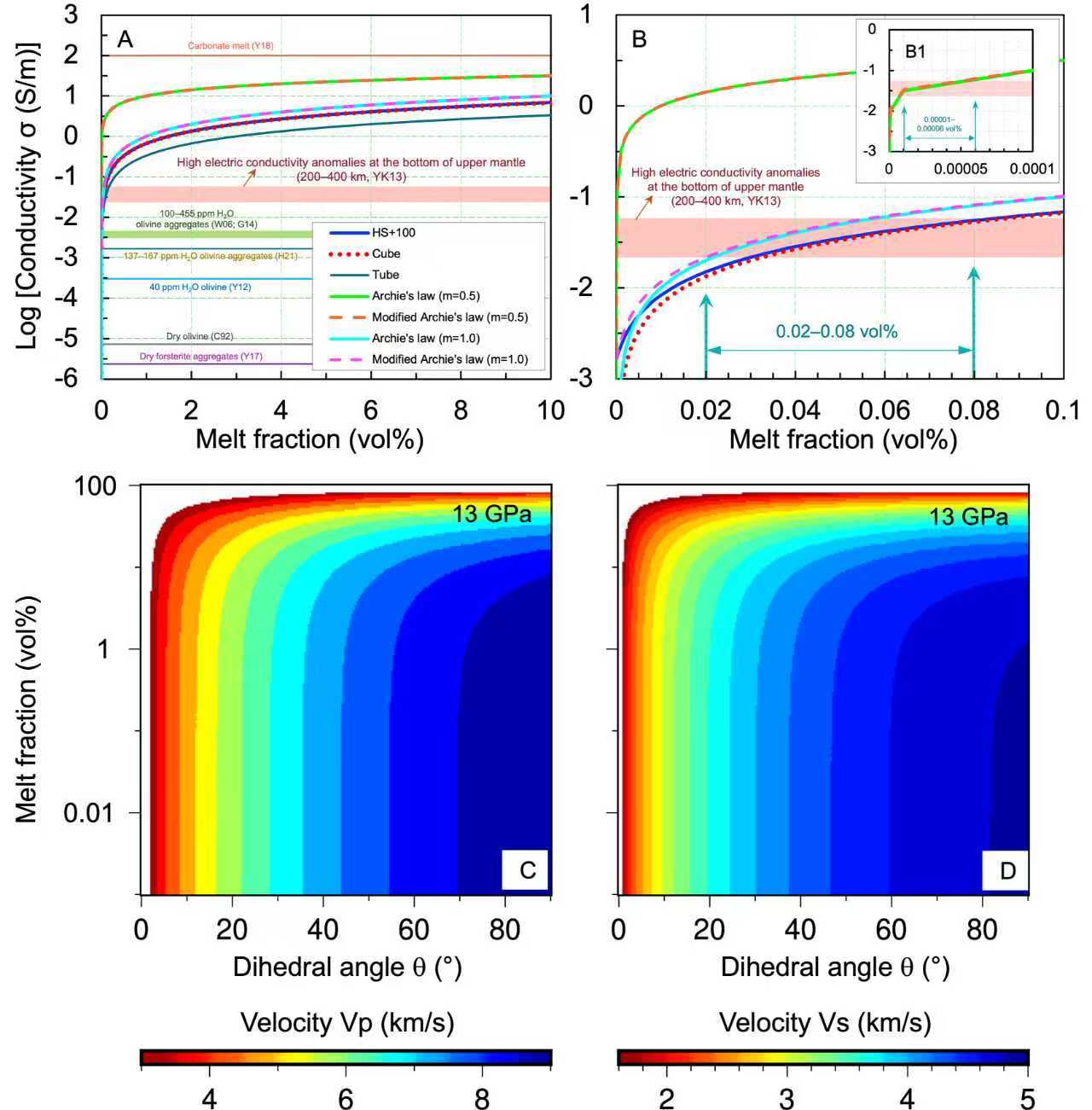 (A-B)电导率模型估算上地幔底部的熔体含量;(C-D)熔体含量及其拓扑结构对地震波速的协同影响。