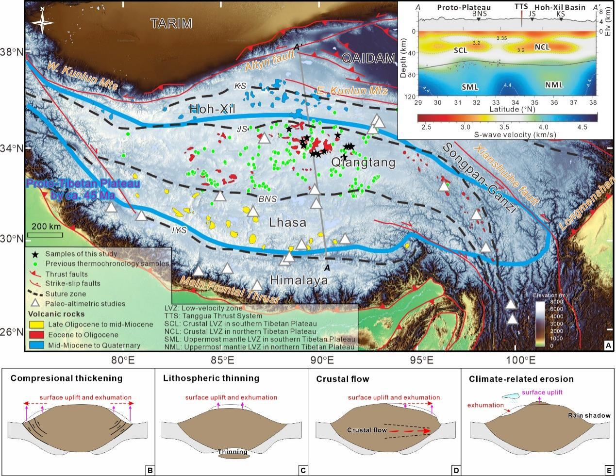 羌塘高原作为始新世“原始青藏高原(Proto-Tibetan Plateau)”的重要组成组分,是理解青藏高原隆升历史、机制及其资源环境效应的关键地区(图1)。现有古高度重建结果表明,羌塘高原早期可能表现为一条东西向山脉,至渐新世才整体隆升并演化为平坦的高原,这一转变可能与地壳熔融有关。然而,羌塘高原早期生长过程及其由山脉向高原转变的地表剥露记录仍不完整。