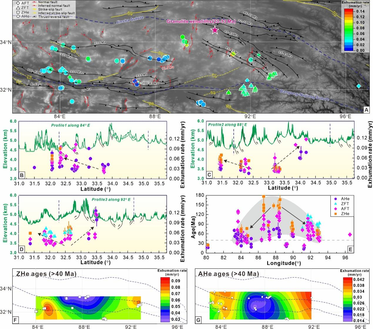 为了解决上述问题,中国科学院广州地球化学研究所龚林博士、王强研究员与青岛崂山实验室李正祥教授及合作者以羌塘高原的始新世花岗岩为研究对象进行系统的矿物学、低温热年代学和热史模拟,并结合区域已发表的低温热年代学数据,以剥露速率时空变化的视角重建了羌塘高原的生长过程及其机制,并取得了如下进展: