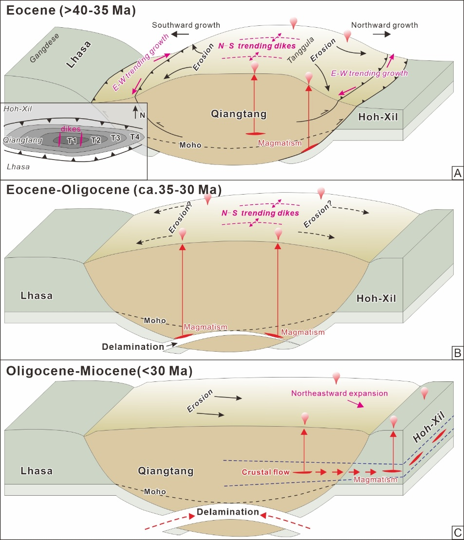 (3)提出了羌塘高原形成的两阶段生长模型(图4):始新世及之前的沿羌塘中部向四周生长和渐新世-中新世向东北向扩展的过程。