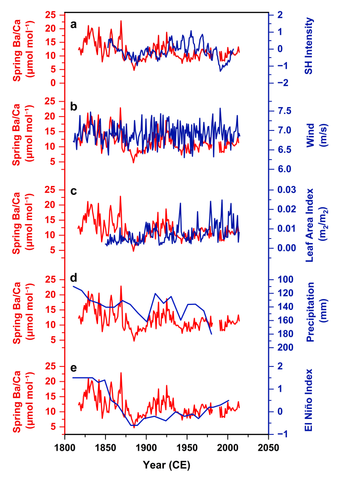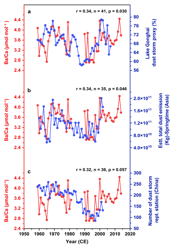 图4 珊瑚骨骼Ba/Ca记录与陆地沙尘代用指标的对比