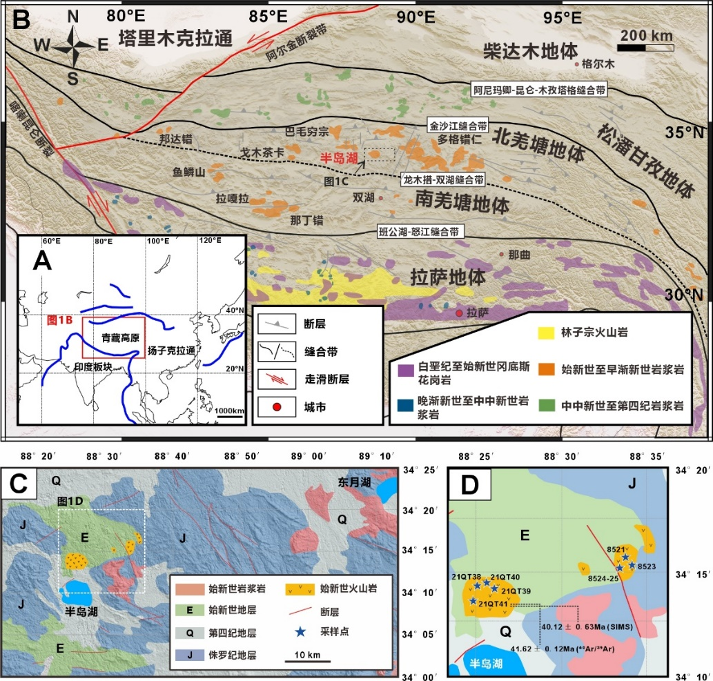 针对上述问题,中国科学院广州地球化学研究所博士陈兵在王强研究员、张修政研究员指导下,以青藏高原北羌塘半岛湖地区新发现的一套始新世高Ba–Sr火山岩为研究对象,系统开展了年代学、全岩地球化学、Sr–Nd–O同位素以及单斜辉石原位Sr–Nd同位素分析(图1)。研究表明,这套火山岩形成于约41–40 Ma,涵盖由较原始的粗面安山岩到较演化的粗面岩,但均具有异常高的Ba和Sr含量,并显示一致的富集Sr–Nd同位素组成及偏高的锆石δ18O值(图2A-C)。这说明,其Ba–Sr富集特征并非单纯由浅部岩浆分异产生,而是继承自深部富集源区。