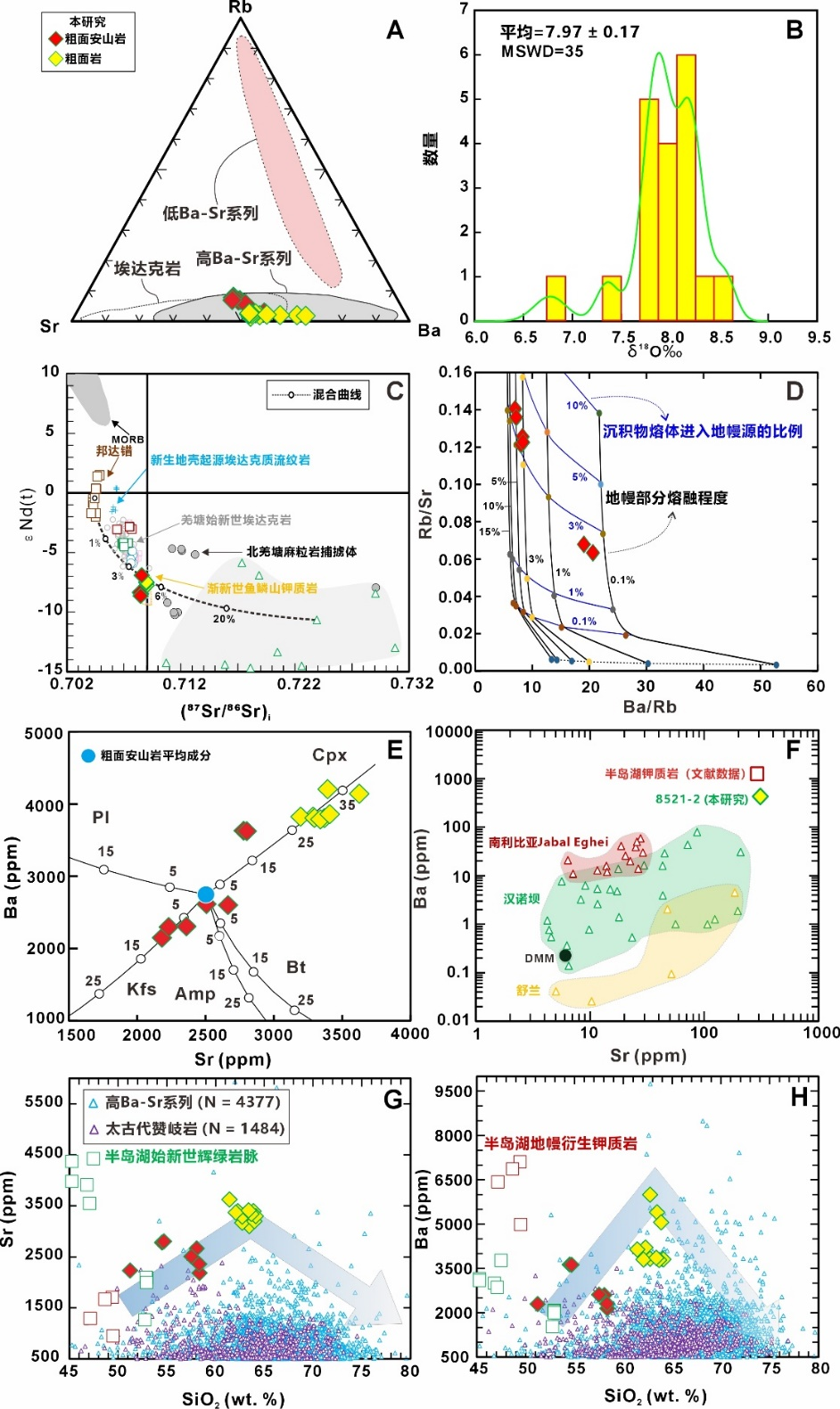 综合微量元素特征、同位素约束和模拟结果,研究认为,半岛湖高Ba–Sr岩浆来源于受到松潘–甘孜三叠纪沉积物交代的富集岩石圈地幔(图2C和D)。进一步的分离结晶模拟显示,约30%–35%的单斜辉石分离结晶对Ba–Sr富集起到了后期放大作用,但并不是形成这一特征的根本原因(图2E)。由此,文章厘清了高Ba–Sr岩浆形成中的控制层级:源区富集是主导因素,岩浆分异是次级放大因素(图2F-H)。