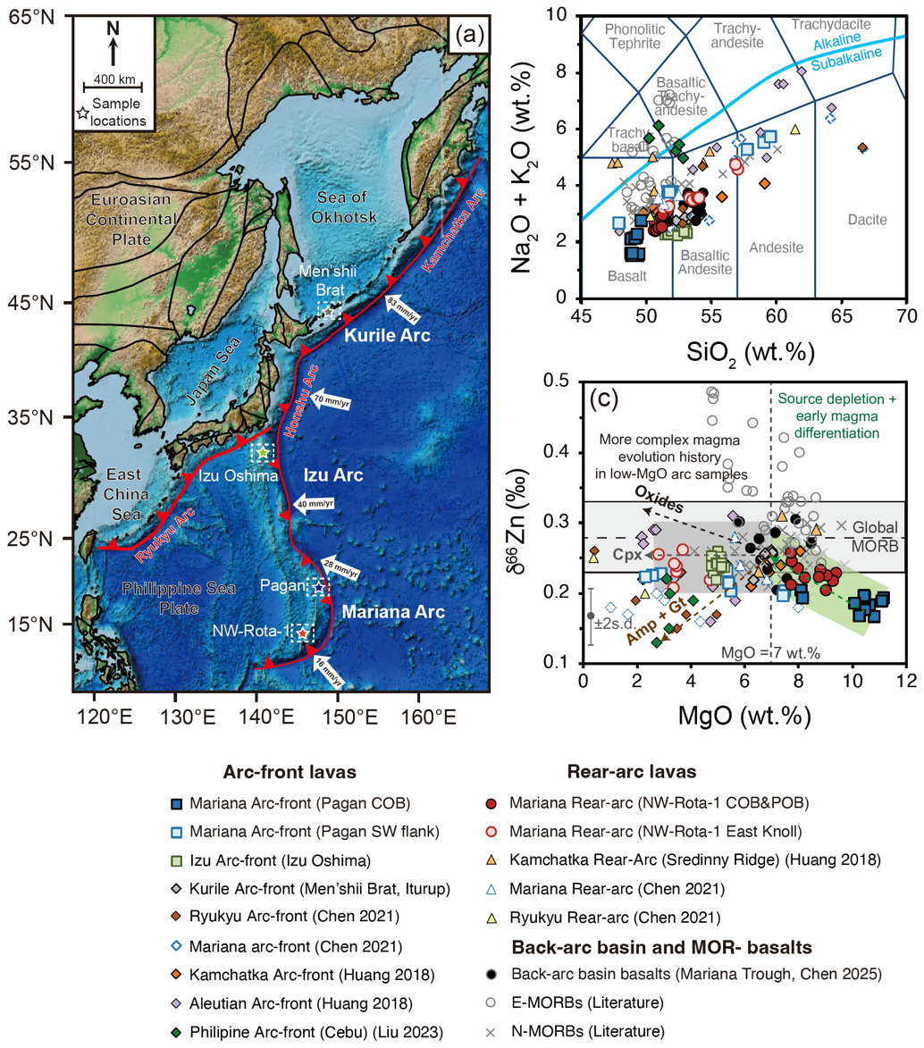 俯冲带是地球浅表与深部圈层间物质循环的纽带。长期以来,俯冲板片物质及其释放的熔/流体和弧前地幔楔蛇纹岩及其流体等外来组分输入被认为是控制岛弧岩浆地球化学组成的主导因素。弧下地幔楔本身物质是岛弧岩浆的主要源区组成,其本身的不均一性对岛弧岩浆形成究竟发挥何种作用,始终缺乏有效的定量约束。西太平洋俯冲带发育有马里亚纳弧、伊豆弧和千岛弧等一系列典型洋内岛弧体系,是研究俯冲带岩浆成因与地幔楔演化的天然实验室。同一岛弧内部的火山前缘(Arc-front)与后弧火山(Rear-arc)之间,岩浆岩地球化学组成展现出显著差异,这些差异究竟反映了俯冲板片输入的变化,还是记录了地幔楔本身亏损程度的差异,仍是国际地学界关注的重要科学问题。