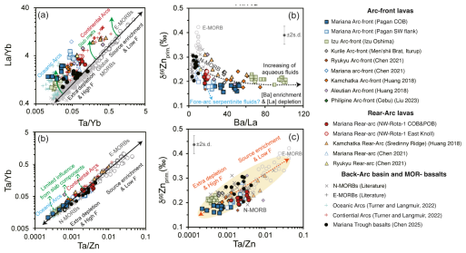 图2. 西太平洋弧岩浆的Ta/Yb-Ta/Zn-δ66Zn图解