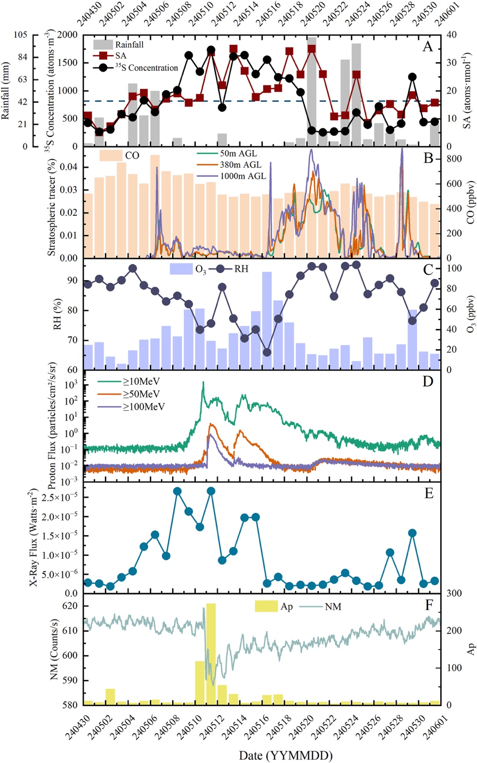图2. 2024年5月近地面硫-35浓度及其他相关参数时间序列: (a) 日均硫35-浓度、比活度、降雨; (b)一氧化碳、 WRF模拟的平流层示踪物;(c) 臭氧浓度、相对湿度; (d) 质子通量‘ (e) X射线通量;(f) 地磁Ap指数和中子计数(引自:Zou et al, GRL 2026)