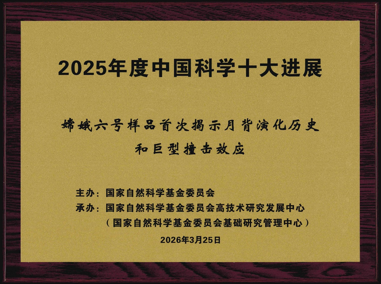2026年3月25日,国家自然科学基金委员会发布了2025年度“中国科学十大进展”,“嫦娥六号样品首次揭示月背演化历史和巨型撞击效应”入选并名列首位。系列工作报道了月球背面样品的研究成果,由中国科学院地质与地球物理研究所、广州地球化学研究所、国家天文台、中国地质科学院地质研究所和南京大学的科研团队完成,研究精确厘定了月背南极—艾特肯盆地和阿波罗盆地的形成时间,发现背面月幔比正面更干、更亏损,明确月磁强度在28亿年前发生反弹,揭示了月背演化历史和巨型撞击的深部效应。
